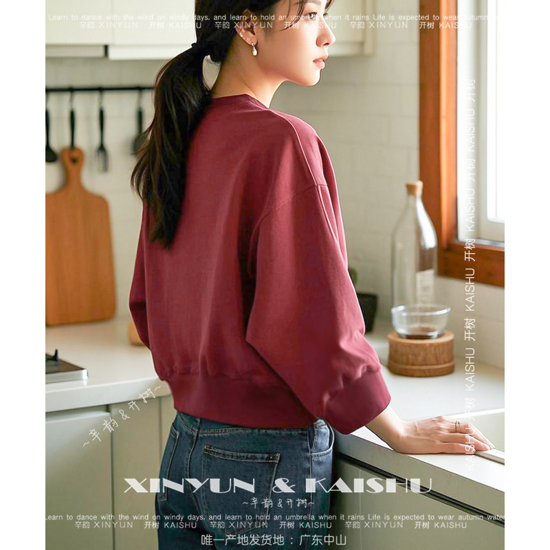 个性小众设计纯棉短款卫衣圆领女春秋季宽松小个子高腰九分袖薄款