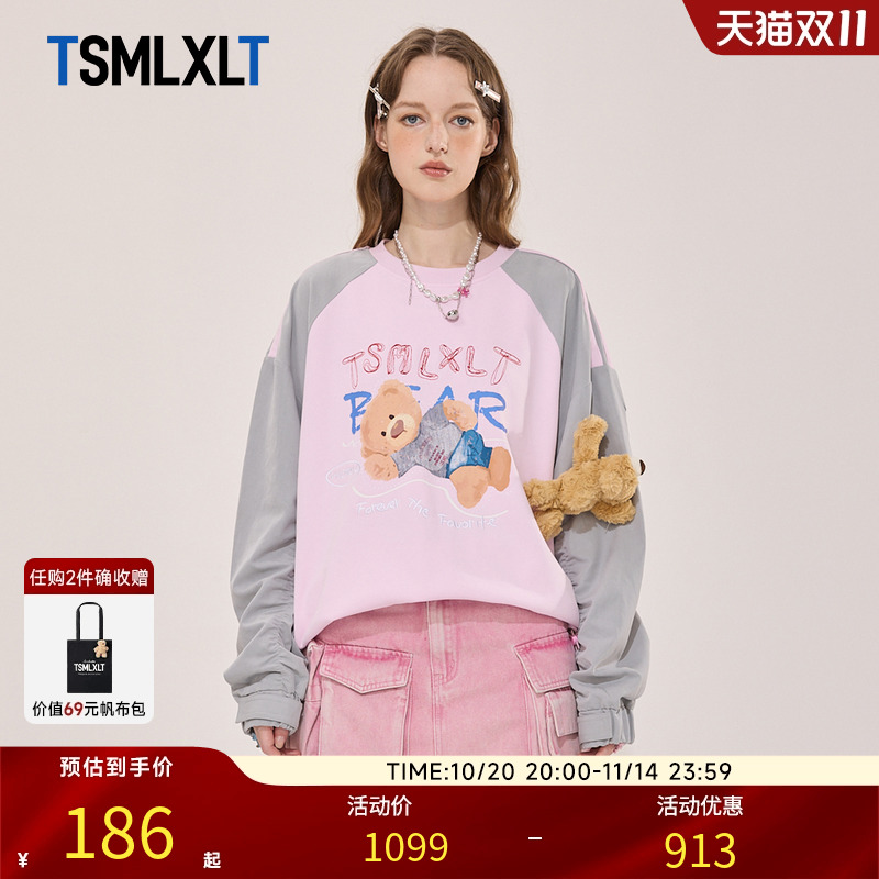 TSMLXLT小熊玩偶套头拼接卫衣女25春夏新品时尚圆领双色上衣情侣