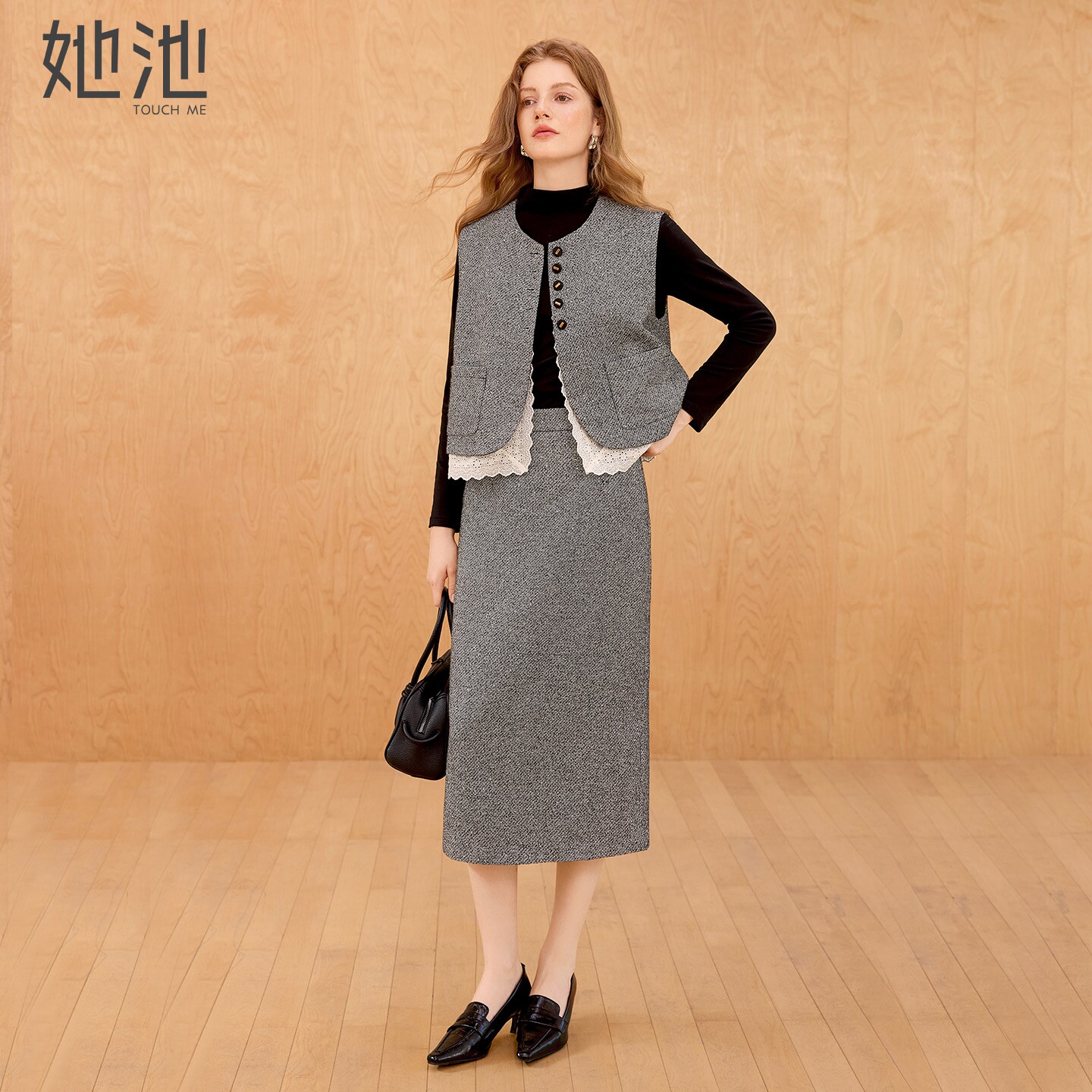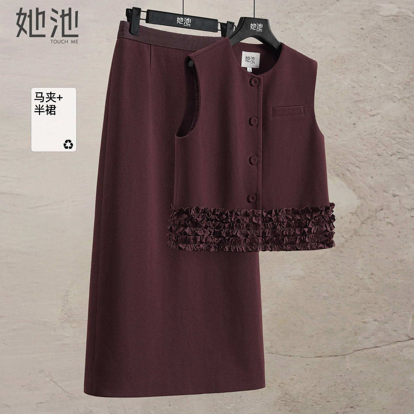 她池时尚套装2026春装新款女装马夹搭中长裙半身裙通勤气质两件套