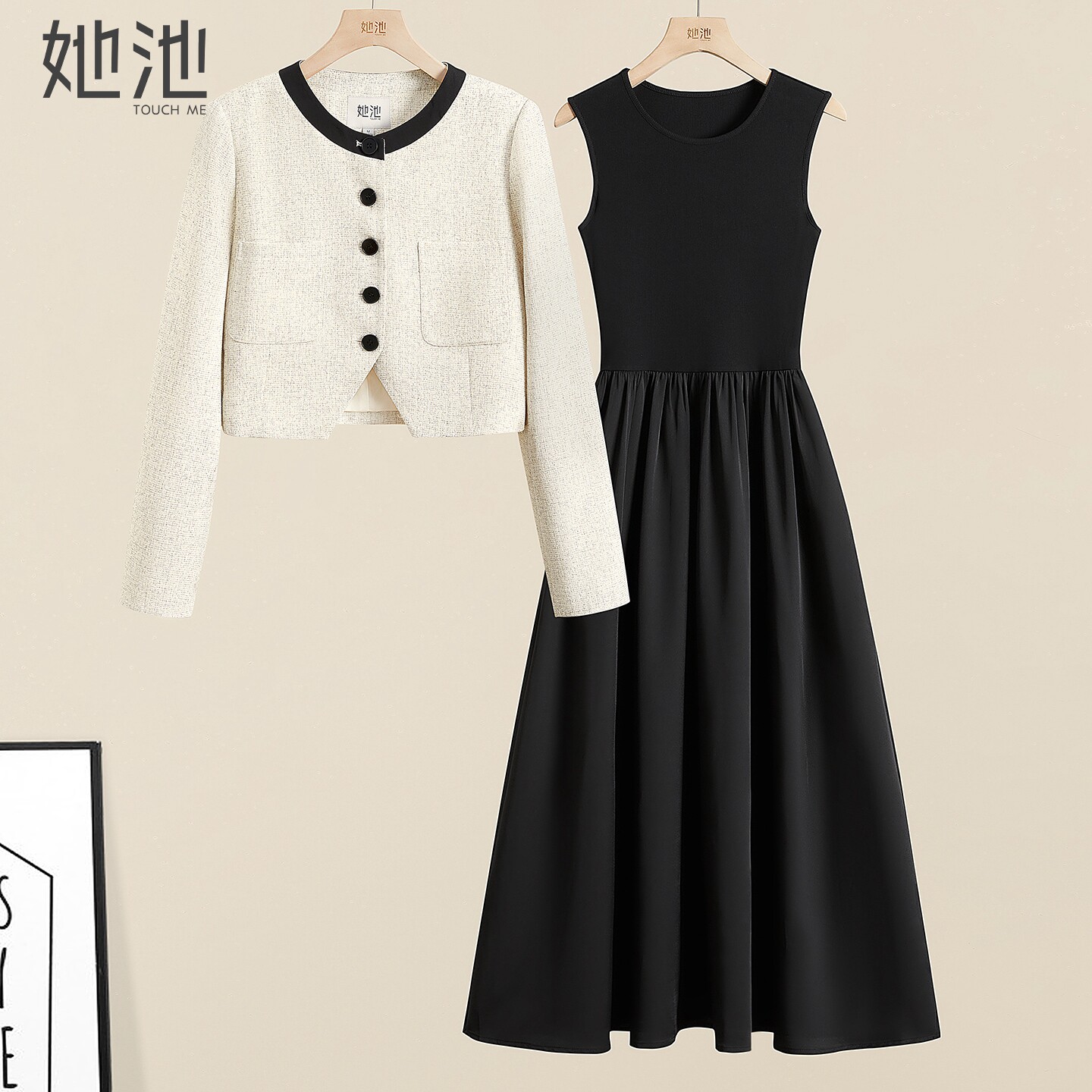 她池时尚套装2026春装新款女装圆领小香风外套搭无袖连衣裙两件套