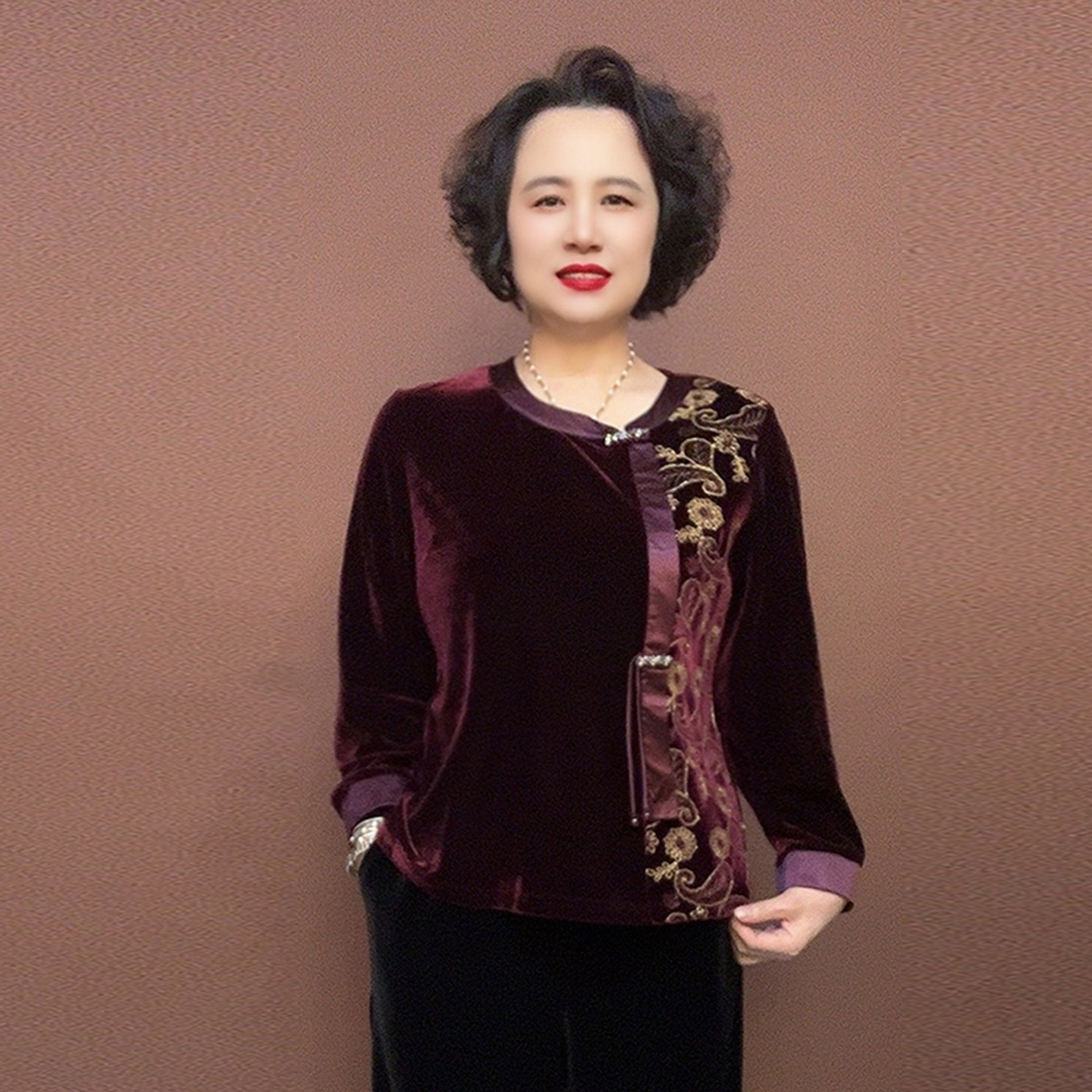 春装新款时尚妈妈丝绒上衣高品质撞色刺绣体恤阔腿裤大码两件套女