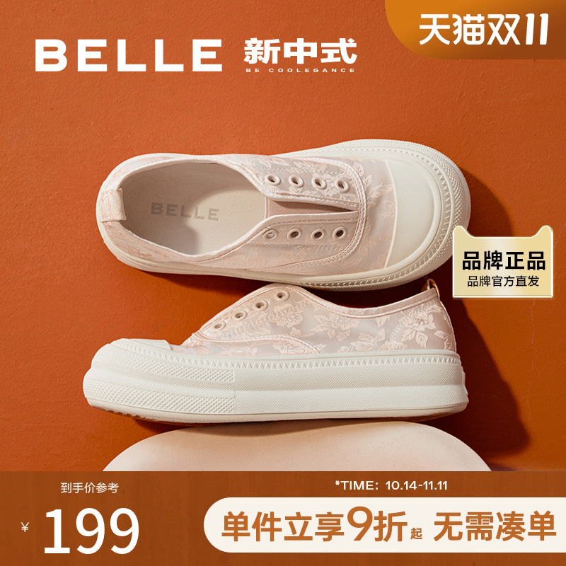 百丽新中式小白鞋女新款鞋子夏季免系带丝绸面厚底帆布鞋B2N1DBM4