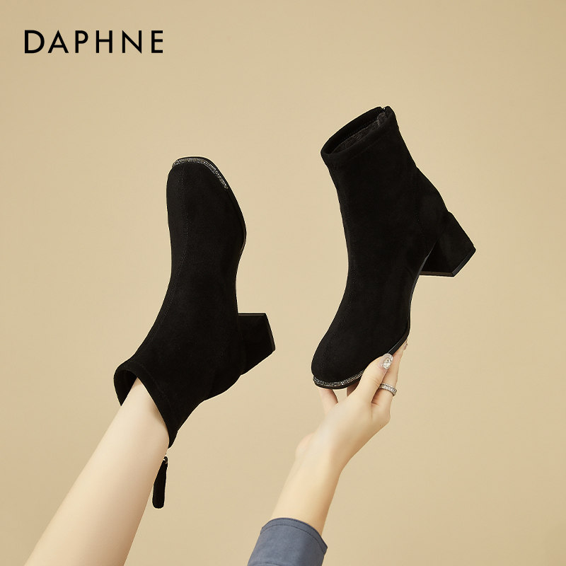 达芙妮黑色绒面短靴女2026秋冬新款网红爆款马丁靴百搭粗跟瘦瘦靴