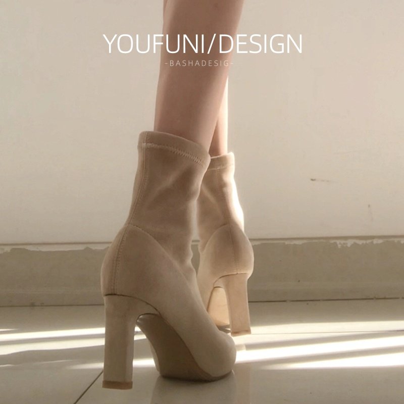 方头粗跟短靴女2025新款春秋单靴网红百搭绒面袜靴套筒弹力瘦瘦靴