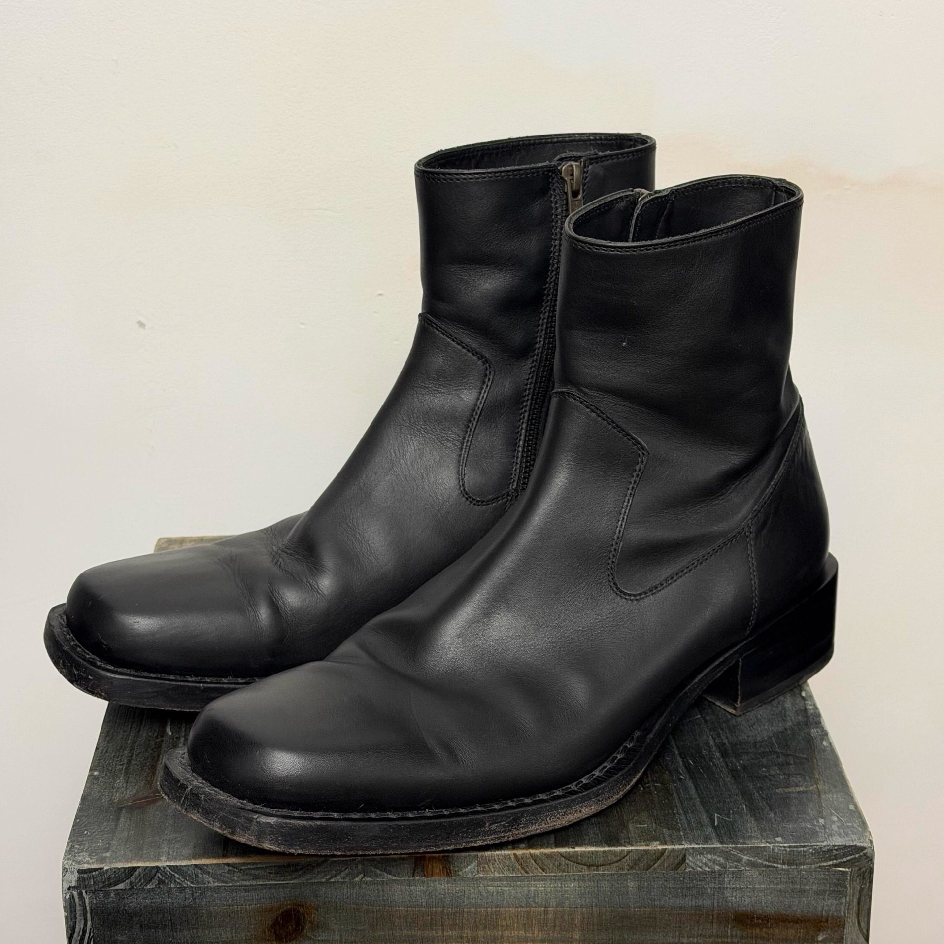 复古暗黑缝线牛仔靴粗跟尖头巫师靴男螺旋拉链做旧切尔西靴骑士靴