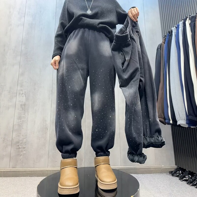 欧洲站2025秋冬新款重工烫钻卫裤女宽松休闲裤百搭高腰束脚哈伦裤