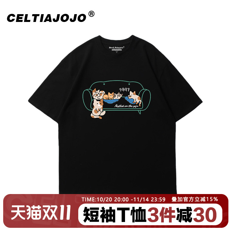 oversize慵懒风小众猫咪印花正肩纯棉黑色短袖t恤上衣2025春夏新