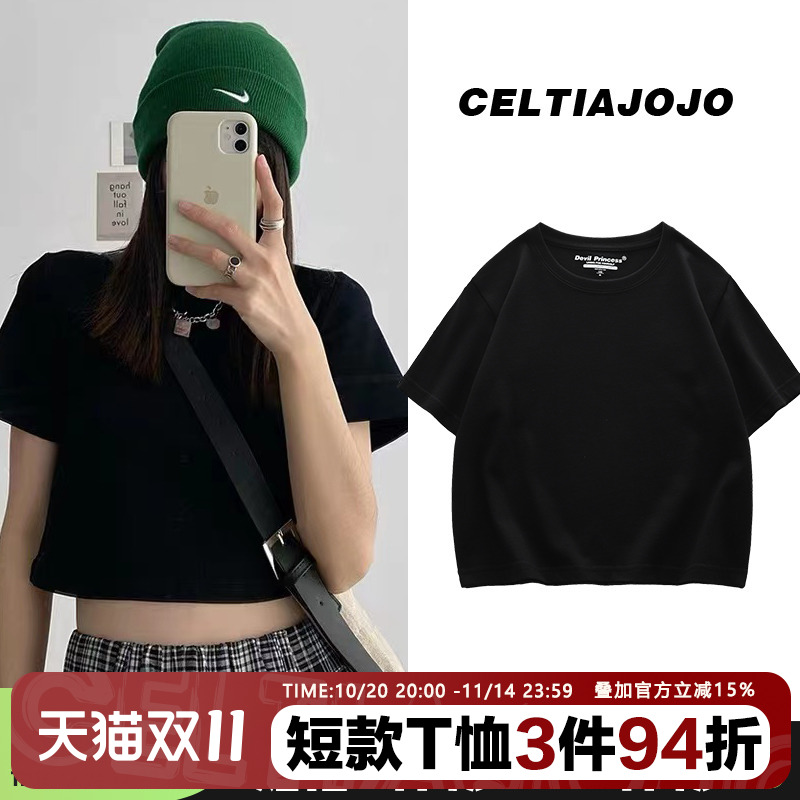 短款纯棉黑色短袖T恤女2025夏季宽松韩版ins高腰显瘦露脐辣妹上衣