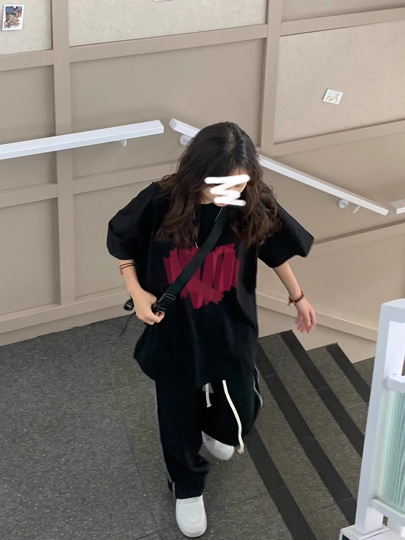 2025夏季新款ins风小众简约设计感纯棉黑色短袖t恤女oversize潮牌
