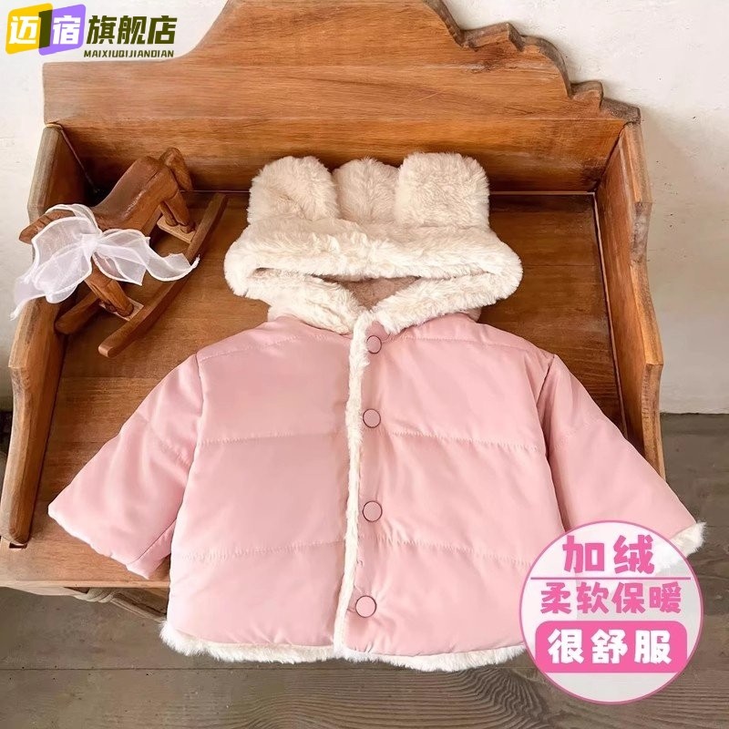 糖果色加绒加厚保暖夹棉加厚棉衣ins韩版男女童宝宝冬季毛毛连帽