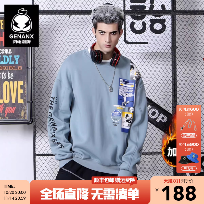 GENANX闪电潮牌圆领套头情侣装加绒加厚卫衣男女款秋冬季新款衣服