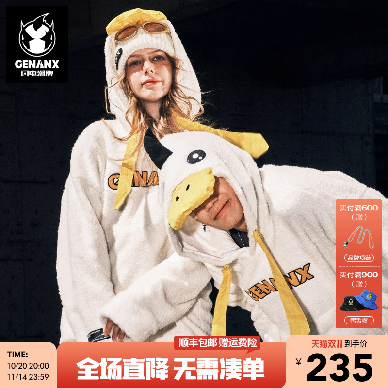 GENANX闪电潮牌陈奕恒同款冬季新款连帽领摇粒绒颗粒绒可爱卫衣男