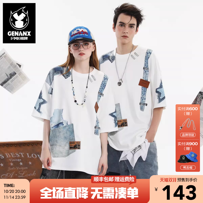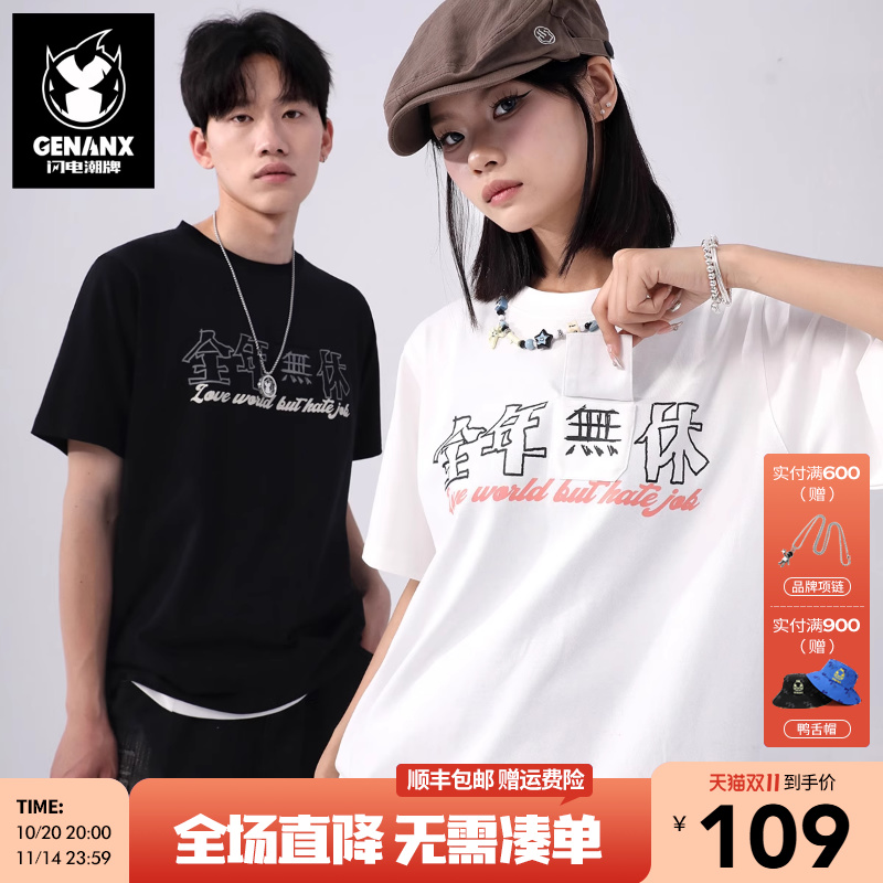 GENANX闪电潮牌夏季情侣装上衣正肩通勤学生男女短袖T恤罗正同款