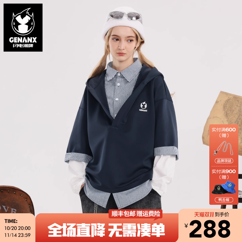 GENANX闪电潮牌2025秋季新款连帽卫衣假两件拼接学生情侣撞色上衣