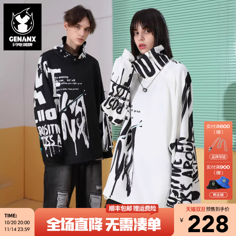 GENANX闪电潮牌zzx同款秋冬情侣假两件卫衣宽松休闲撞色印花上衣