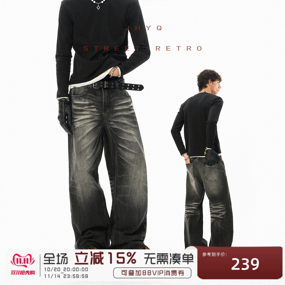 JHYQ重工水洗闪电爆裂纹牛仔裤男美式休闲复古直筒宽松潮牌长裤子