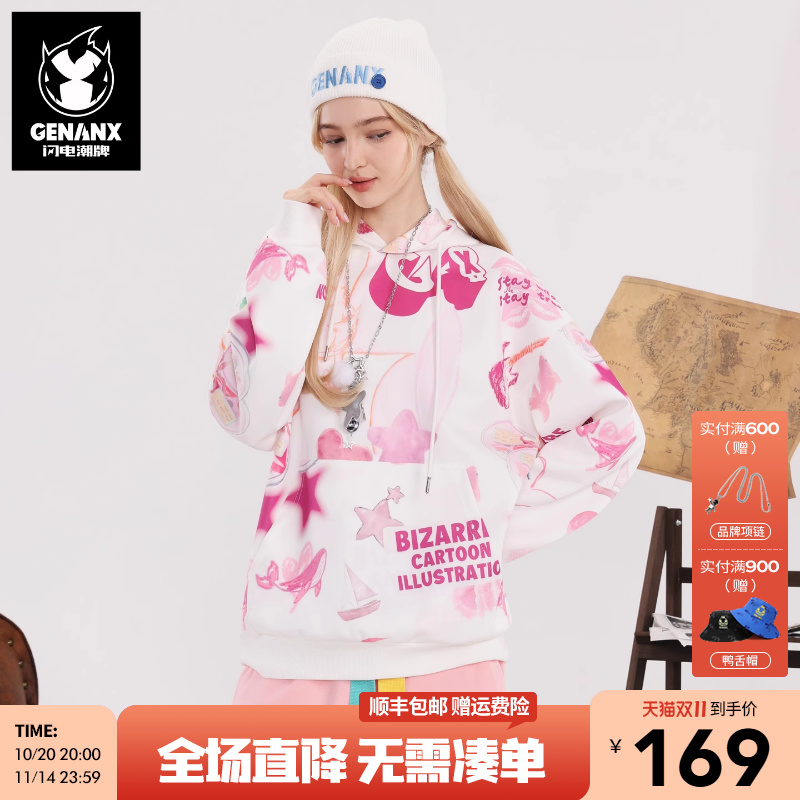 GENANX闪电潮牌2025秋季涂鸦乱花宽松男女同款连帽卫衣杨涵博同款