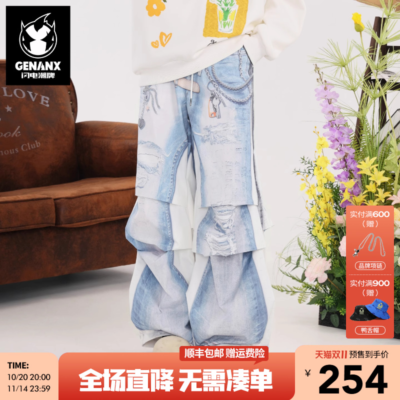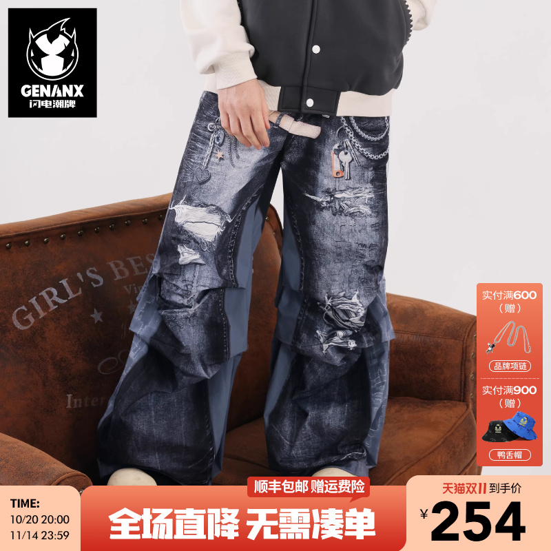 GENANX闪电潮牌2025秋季仿牛仔裤王橹杰同款印花阔腿拖地长休闲男