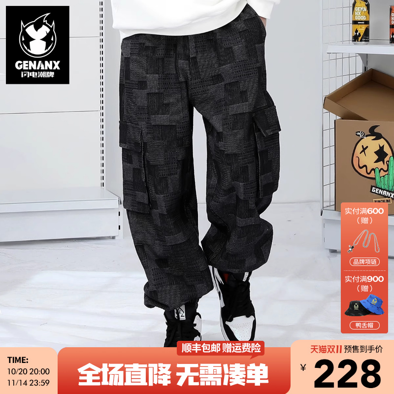 GENANX闪电潮牌运动裤男宽松运动新款多口袋印花收腿休闲裤男学生