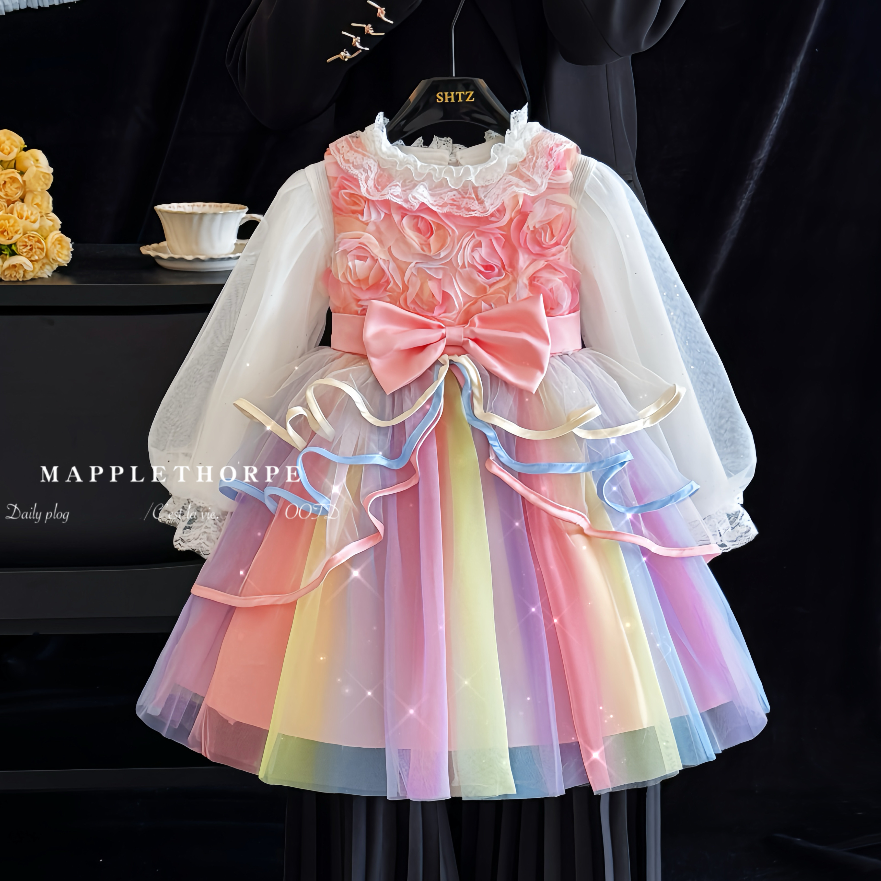 女童公主裙秋装2025新款秋季长袖彩虹生日裙子儿童演出服蓬蓬纱裙