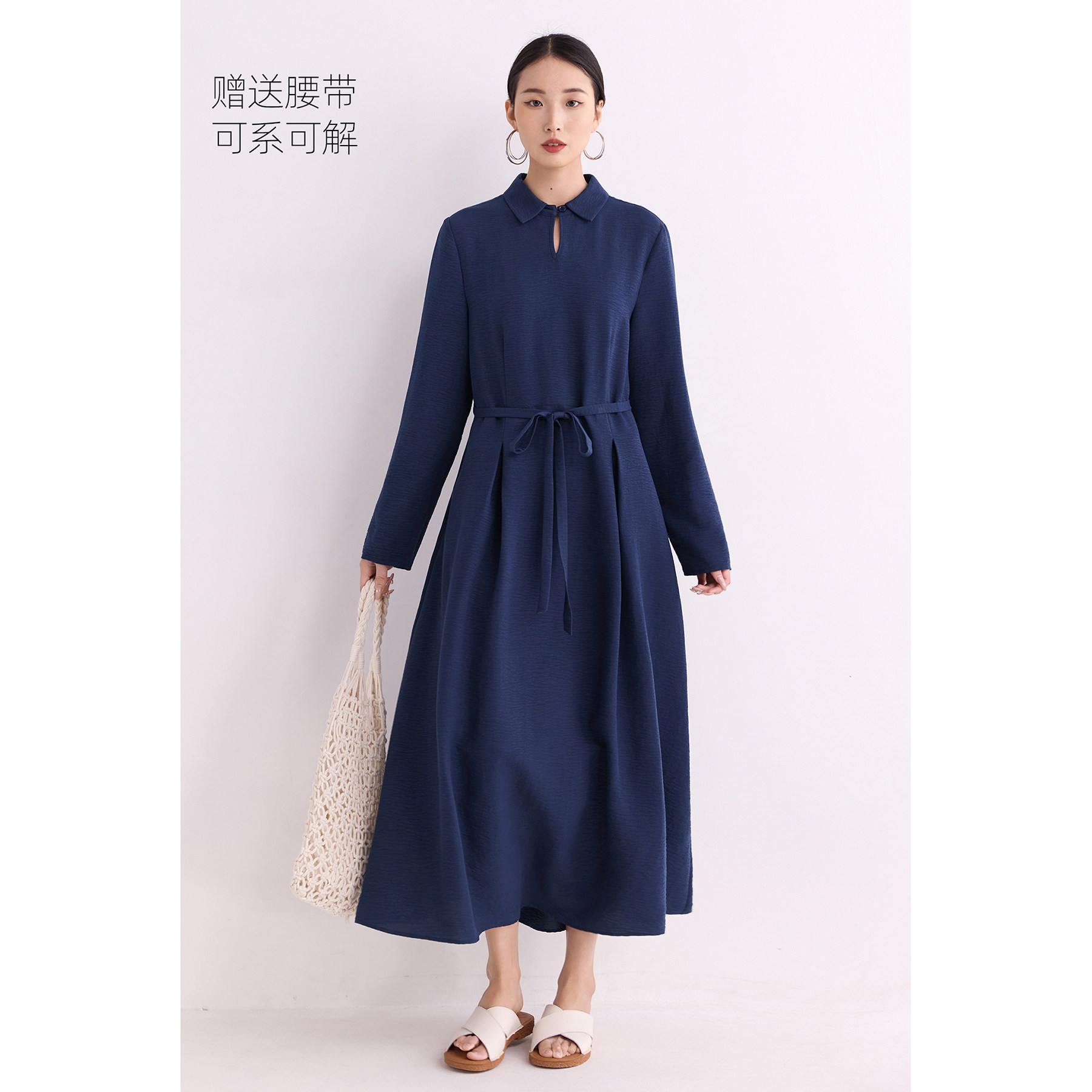 裙子女长袖连衣裙连身裙官方春秋季新款翻领收腰显瘦高级气质长裙