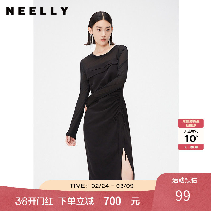 NEELLY纳俪商场同款春秋款黑色抽褶显瘦连衣裙女修身开叉长袖长裙