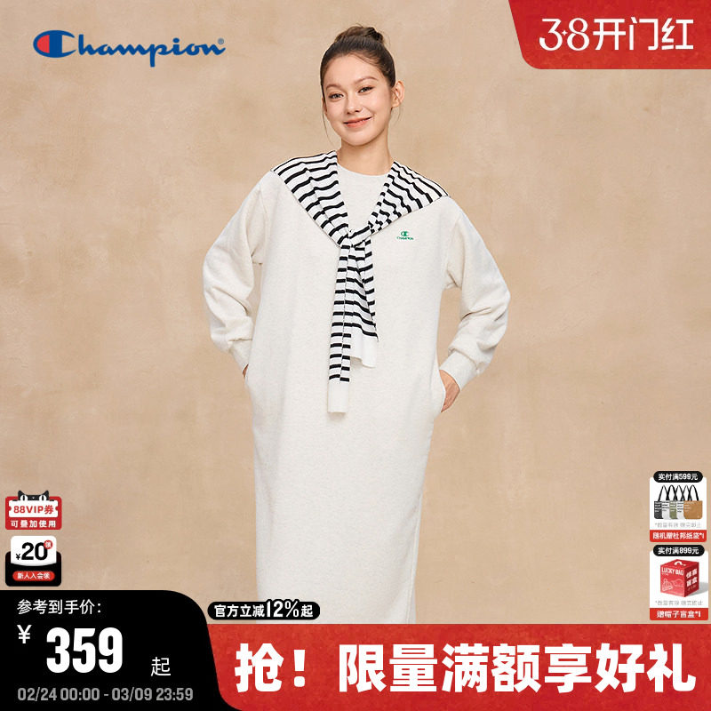 Champion冠军长袖连衣裙女2025秋季新款纯色圆领H型休闲长裙潮牌