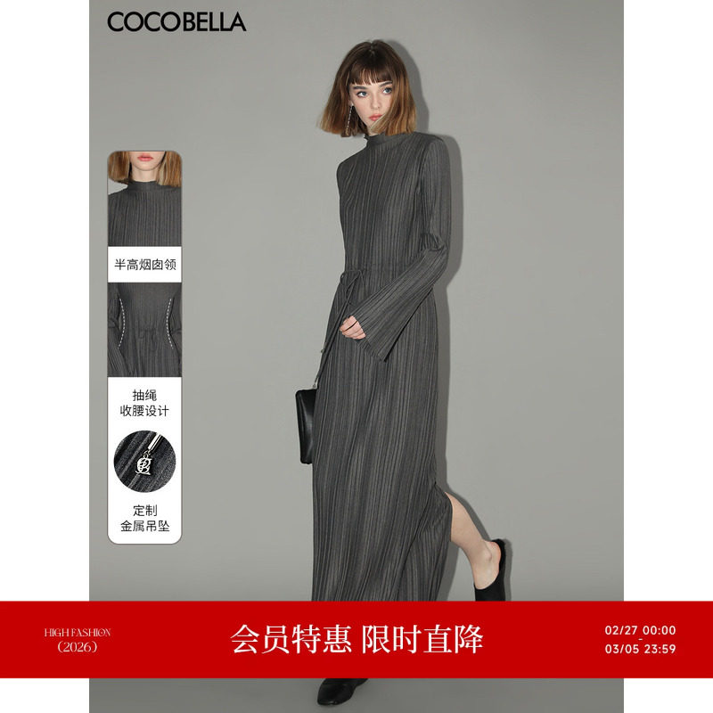 COCOBELLA早春赫本风压褶连衣裙女半高领抽绳长袖显瘦长裙FR3015
