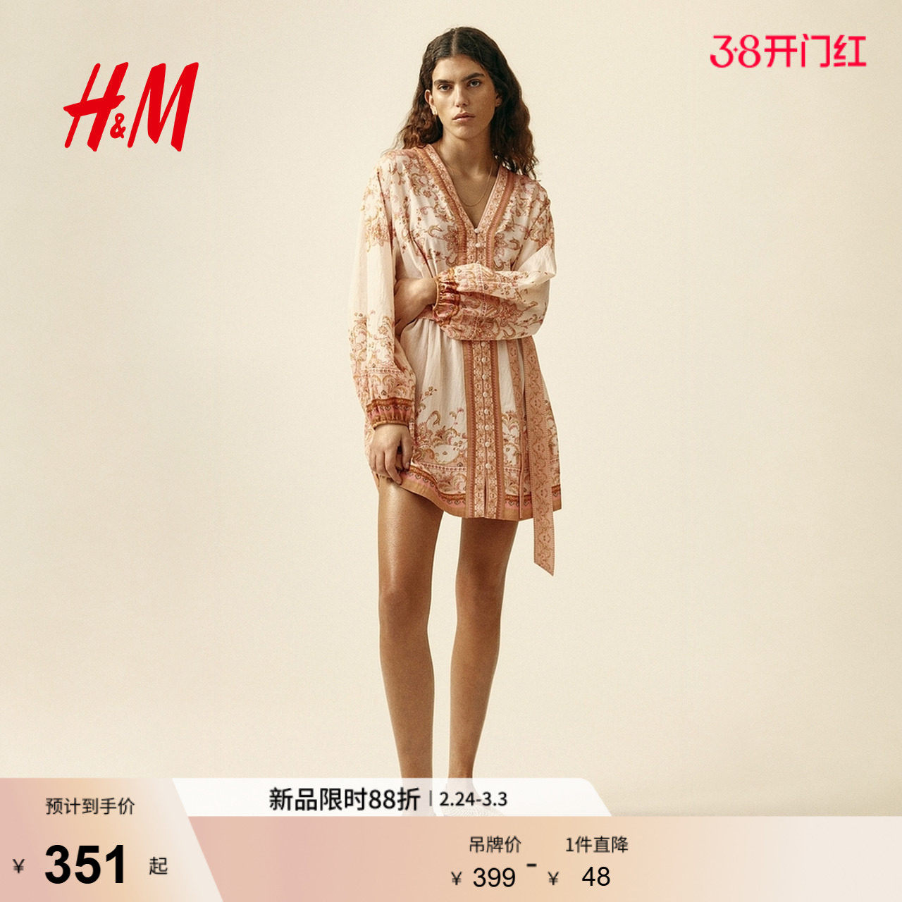 HM女装连衣裙2026新款V领灯笼长袖系带宽松海边穿搭连身裙1321000