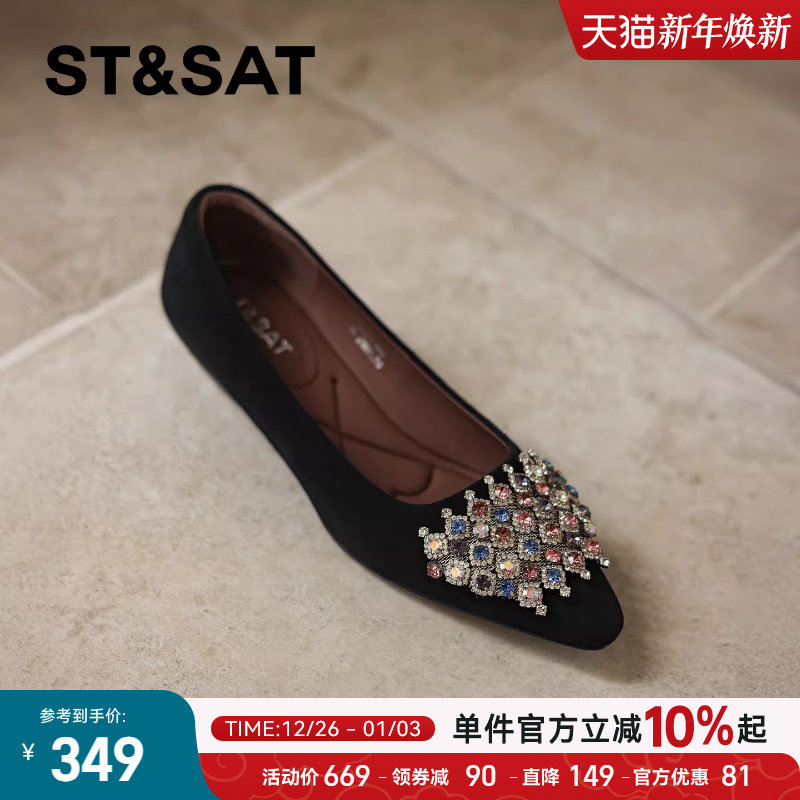 星期六法式优雅浅口单鞋女2025年春季新款水钻装饰坡跟尖头平底鞋