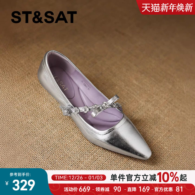 星期六法式尖头水钻单鞋女2025春季新款平底坡跟蝴蝶结浅口小皮鞋