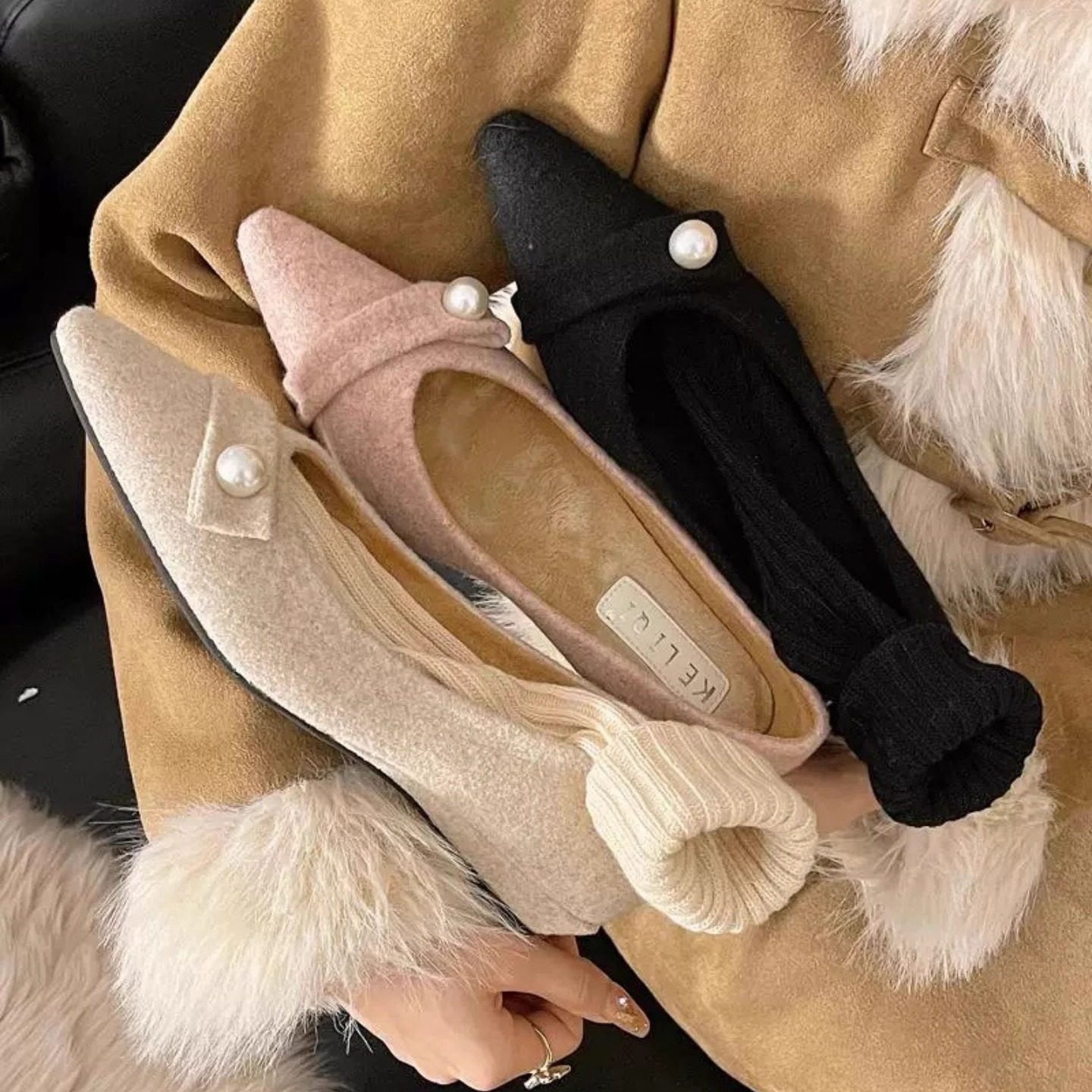 真毛毛新款法式尖头小香晚晚风毛呢子名媛珍珠加绒保暖坡跟单鞋女