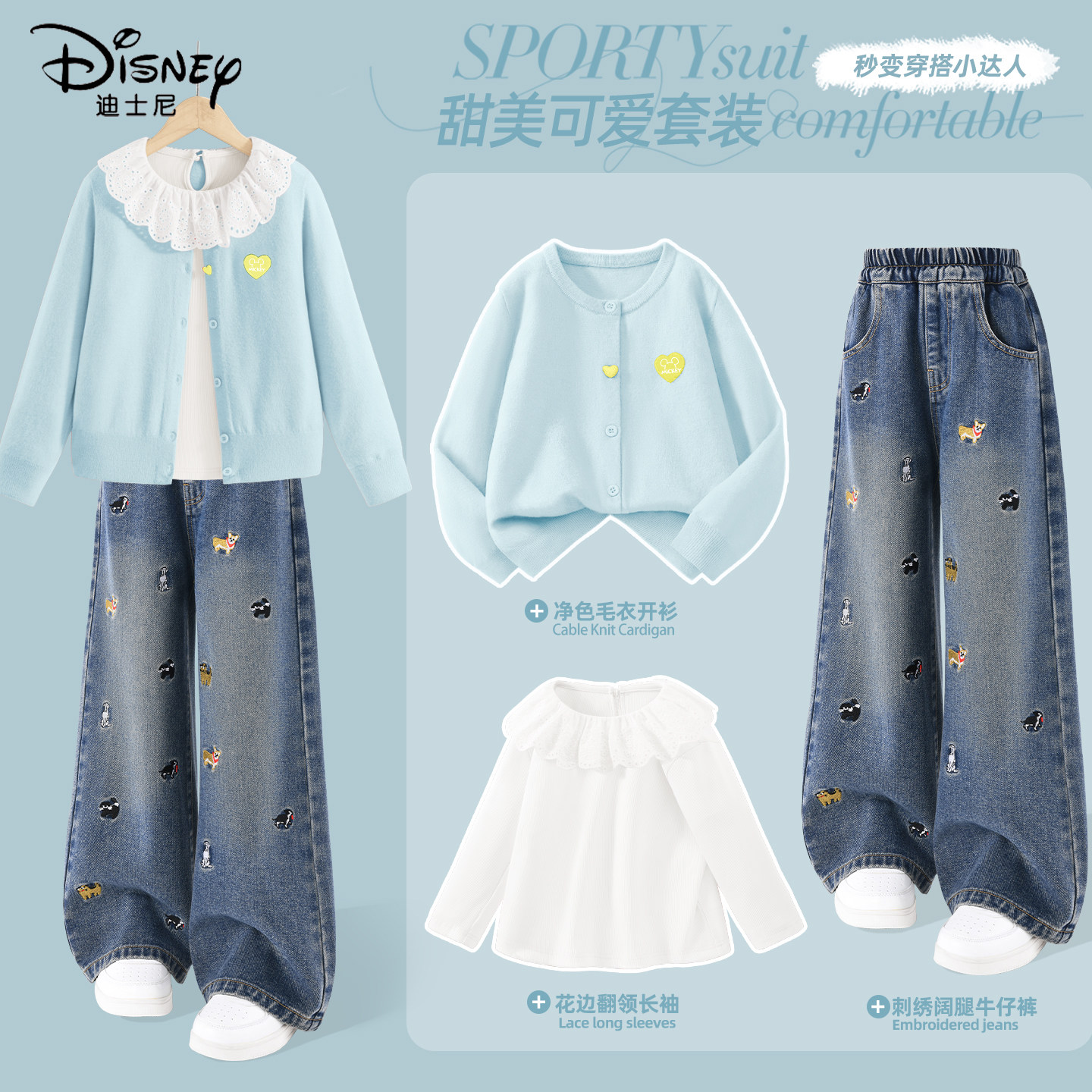 迪士尼女童春装套装2026新款今年流行毛衣三件套洋气儿童牛仔裤潮