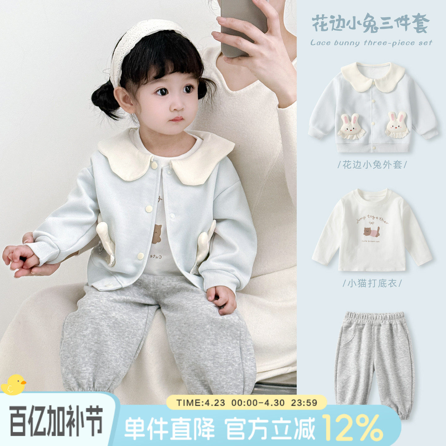 女童套装2026春装薄款婴儿春季外穿衣服女宝宝卫衣卫裤洋气三件套
