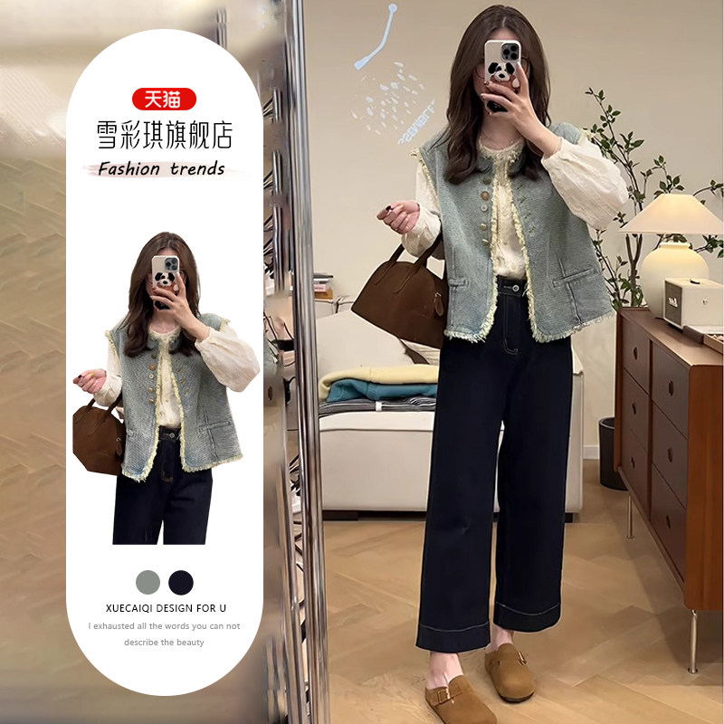 春装复古风穿搭一整套装女大码mm别致显瘦牛仔马甲外套小衫三件套