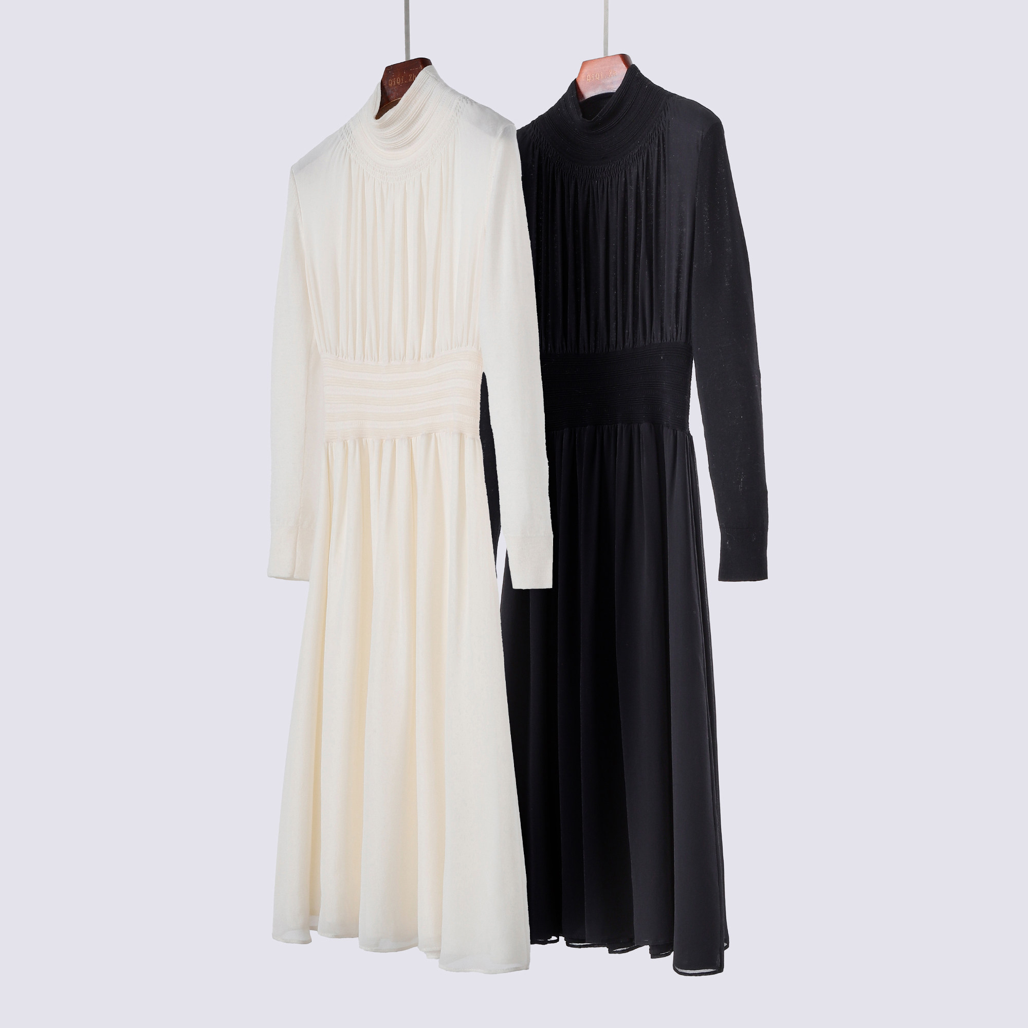 早春新款 真丝拼桑蚕丝修身连衣裙 精致高领长袖褶皱气质打底裙