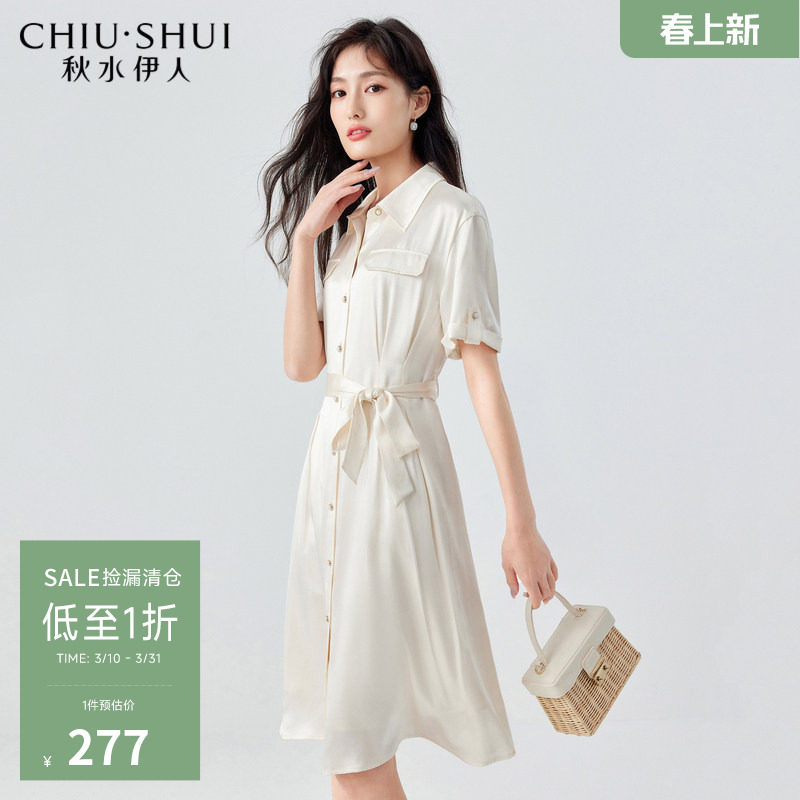 气质衬衫领系带收腰显瘦纯色桑蚕丝连衣裙新款弹力真丝双乔中长裙