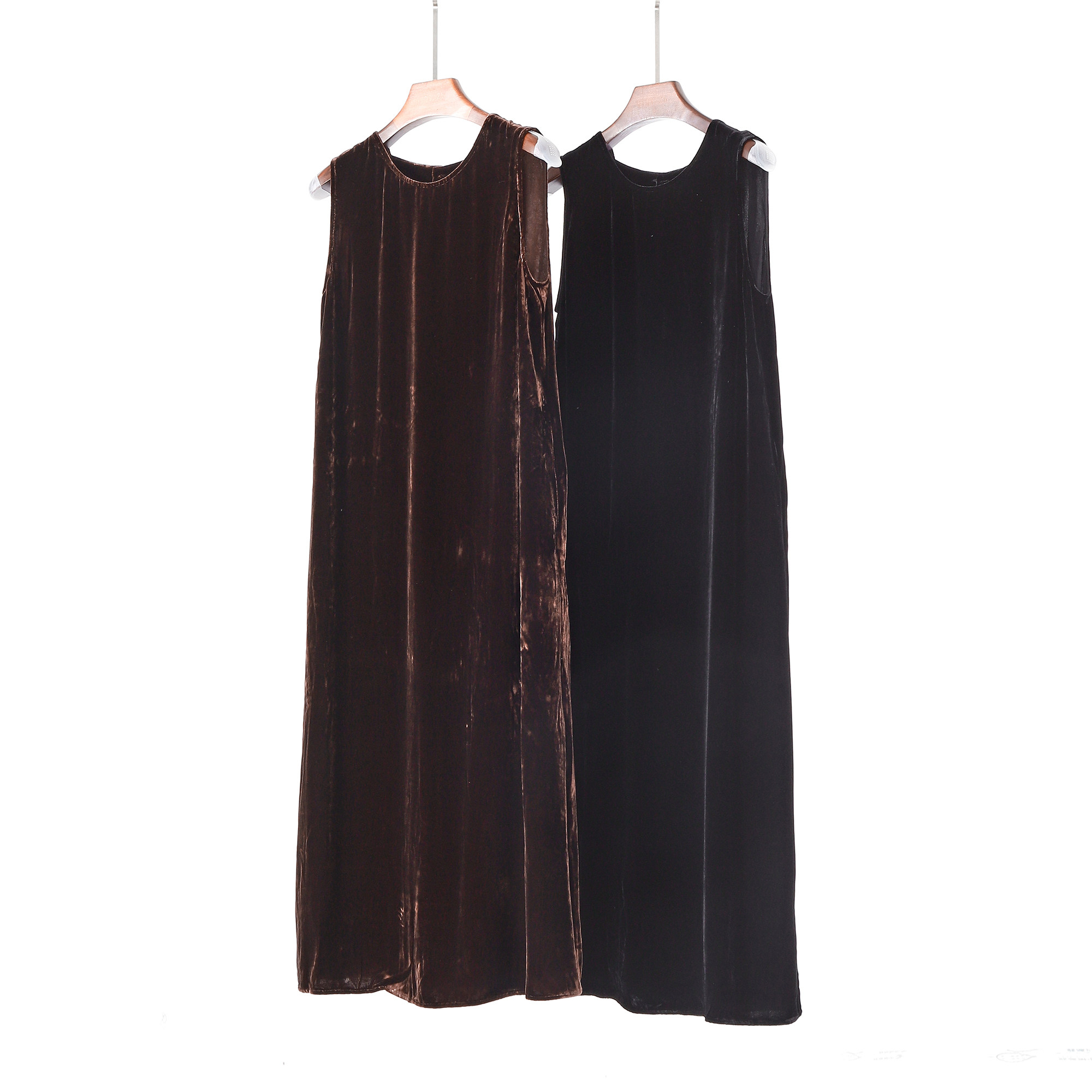 早春新款 极简气质真丝丝绒A字裙摆无袖背心连衣裙 桑蚕丝长裙