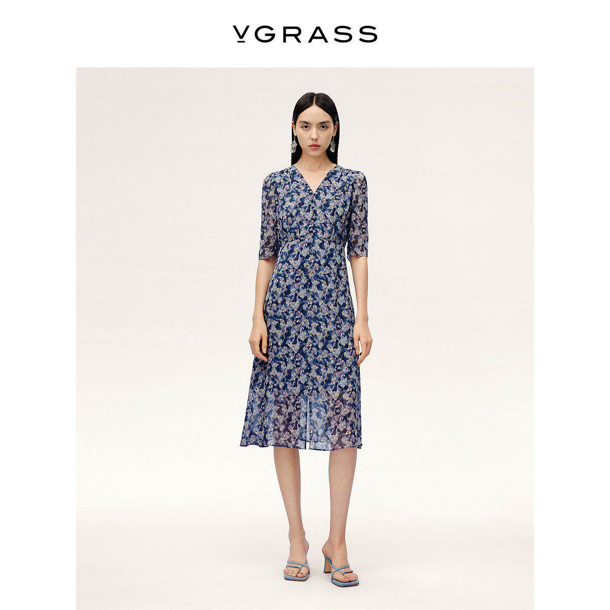VGRASS维格娜丝夏季新款模糊剪影式印花100%桑蚕丝乔其连衣裙