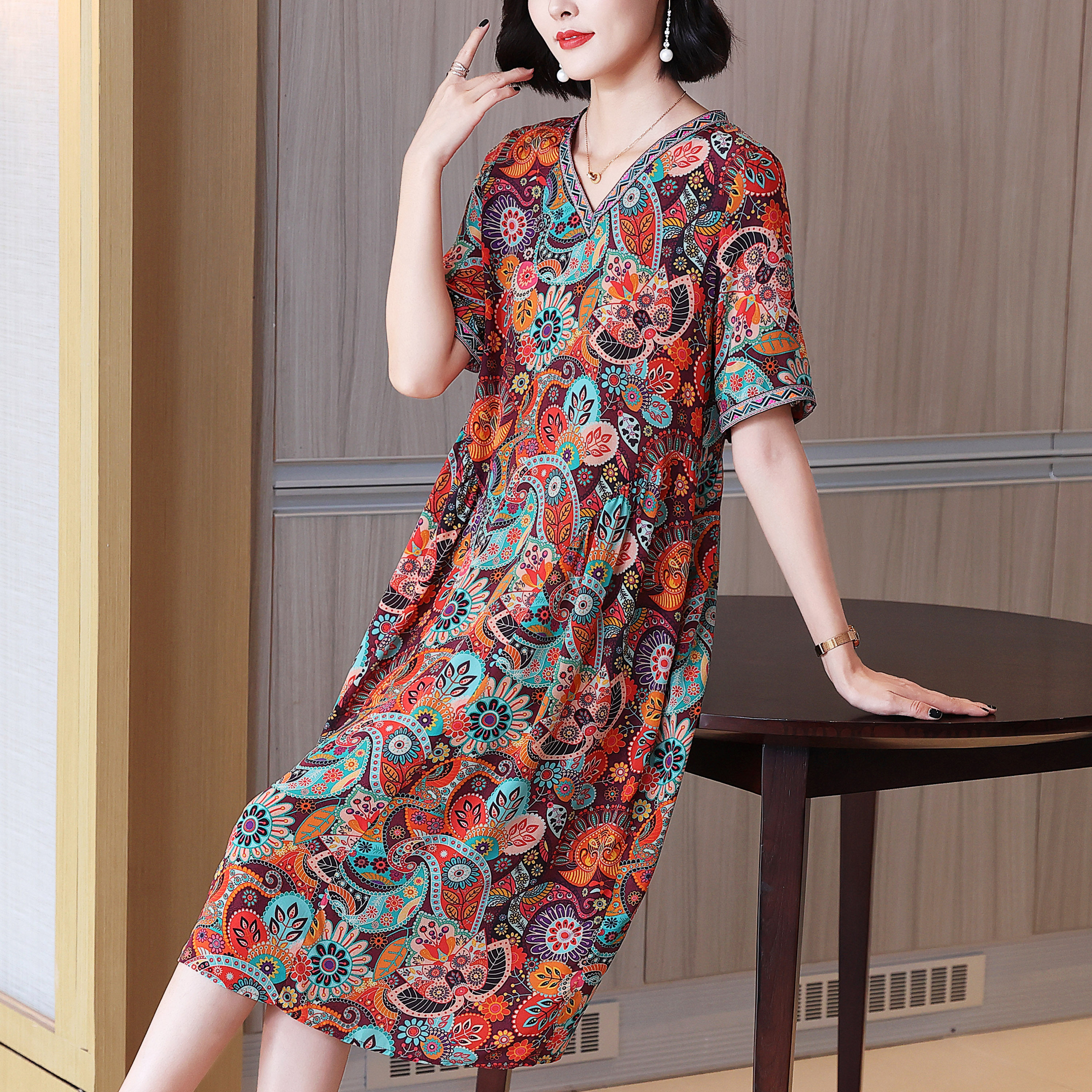 水墨佳人妈妈夏装真丝桑蚕丝连衣裙新款中老年女士阔太太高贵洋气