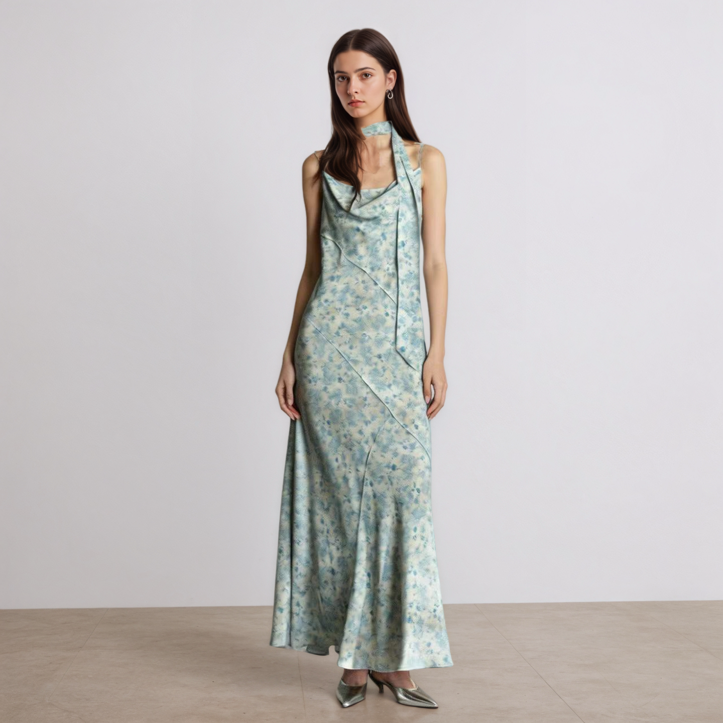 【东方美人】三层印花桑蚕丝混纺荡领飘带吊带连衣裙女26夏季新款