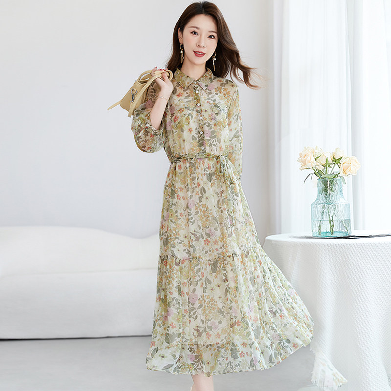 早春新款 双层桑蚕丝度假风浪漫长裙 真丝灯笼袖大摆长袖连衣裙