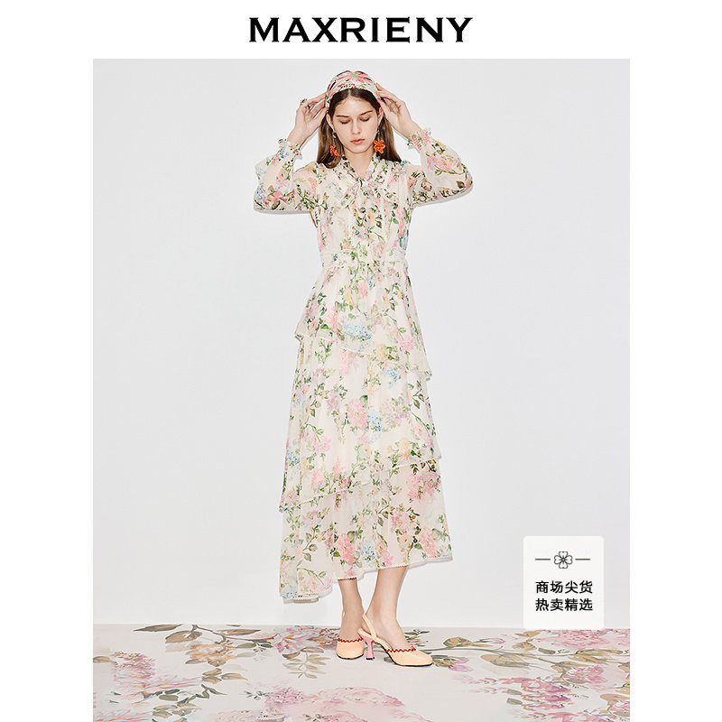 【商场同款】MAXRIENY桑蚕丝连衣裙2026春季新款V领收腰印花裙子