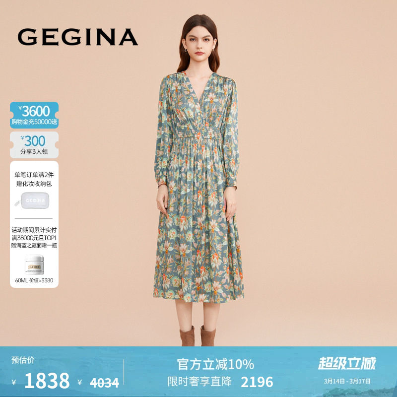 【桑蚕丝】GEGINA吉吉娜新款松紧收腰连衣裙女中长款真丝印花裙子