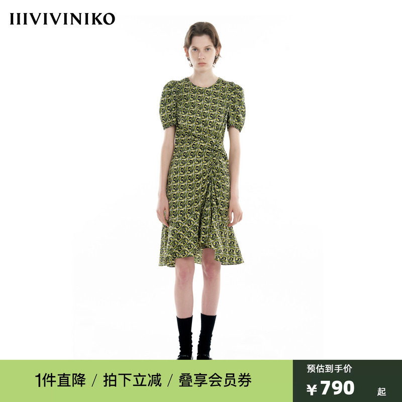 IIIVIVINIKO2024秋新款桑蚕丝不规则抽褶鱼尾连衣裙女R430641129A