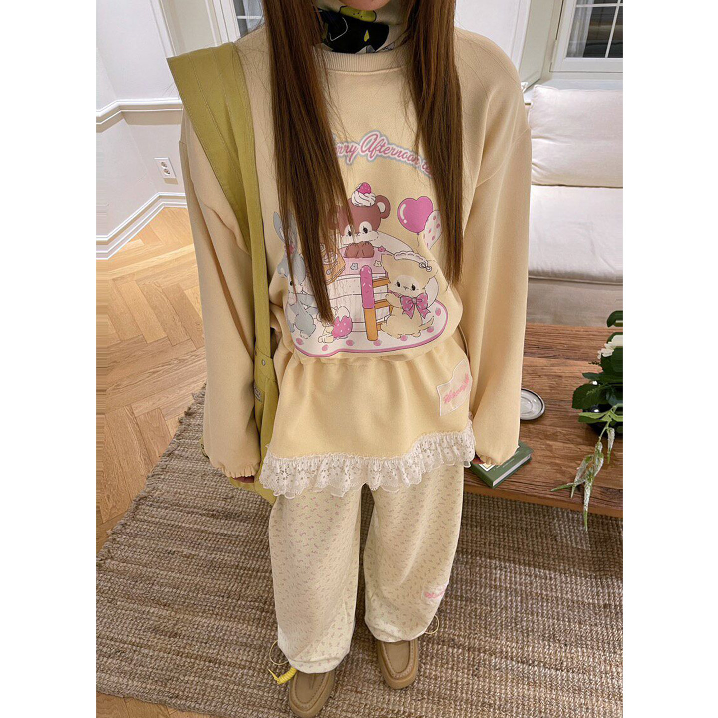 韩国东大门2026春季新款时尚减龄卡通蕾丝花边抽绳收腰卫衣女