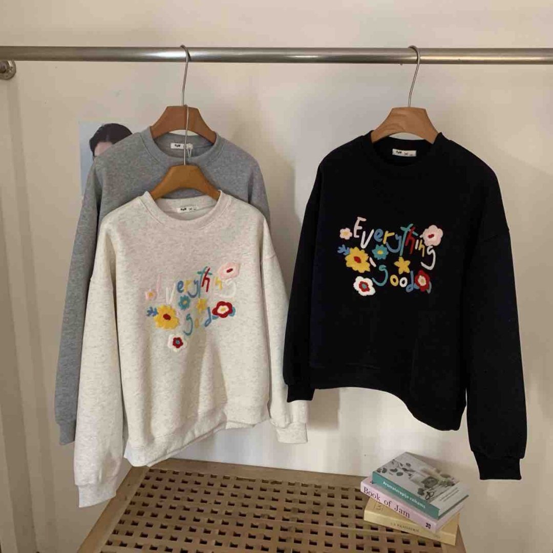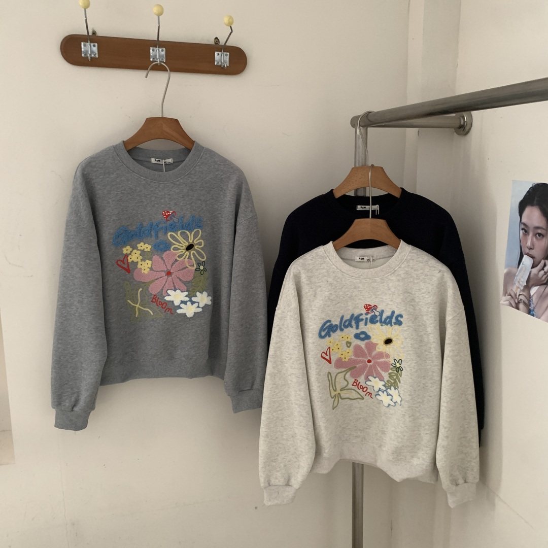 东大门26年春新款 刺绣花朵宽松韩版短款长袖女士卫衣圆领韩系T恤