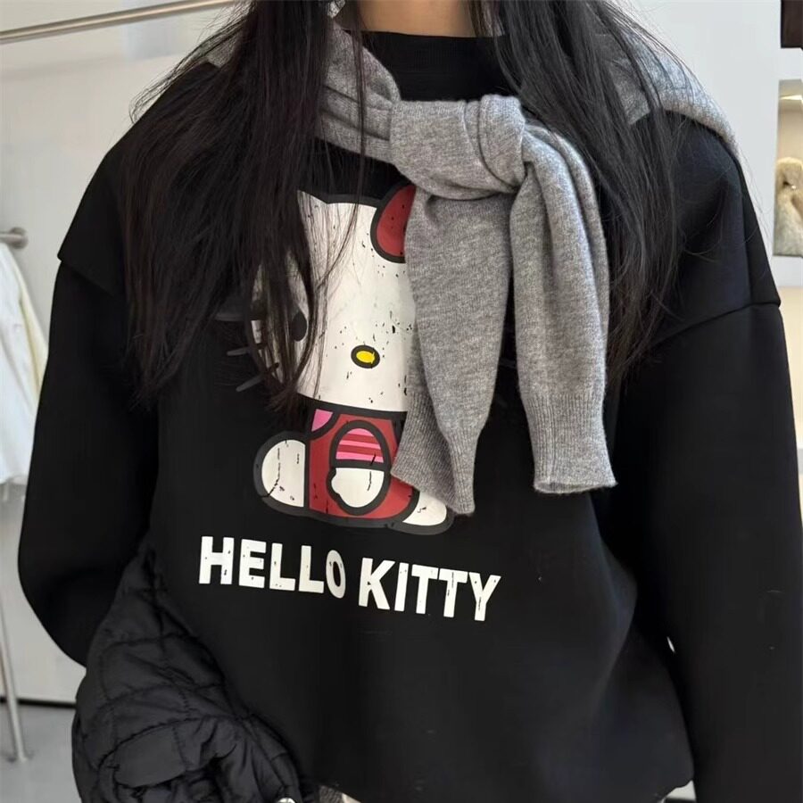 韩国东大门2025冬季新款可爱卡通KT猫印花圆领休闲减龄加绒卫衣女