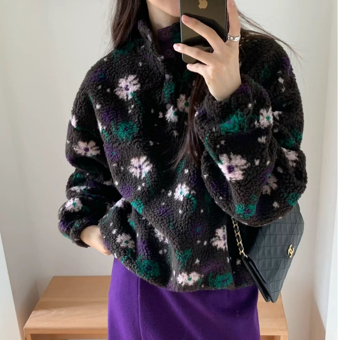 韩国东大门2025秋冬款洋气立领宽松抽绳花朵羊羔毛保暖卫衣外套女