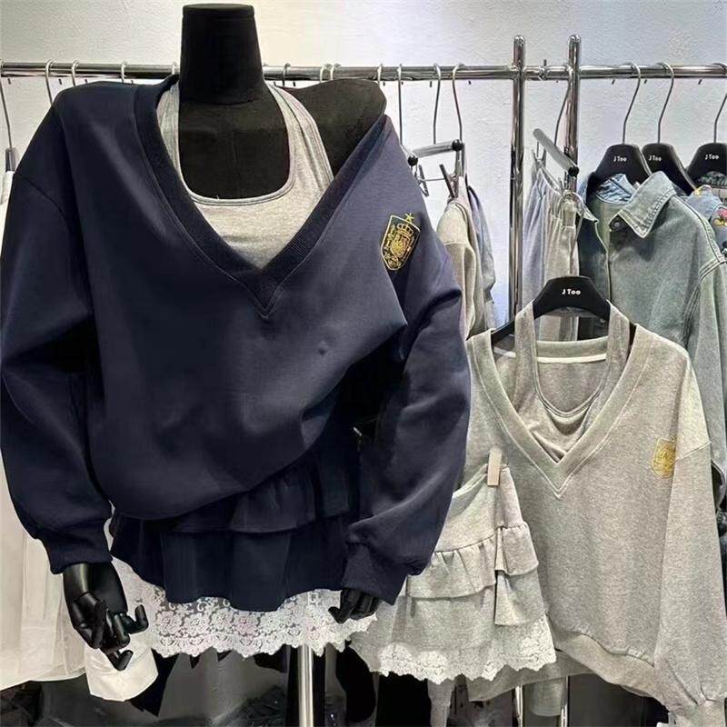 韩国东大门重工刺绣卡通减龄宽松慵懒风拼色假两件卫衣女2026春装